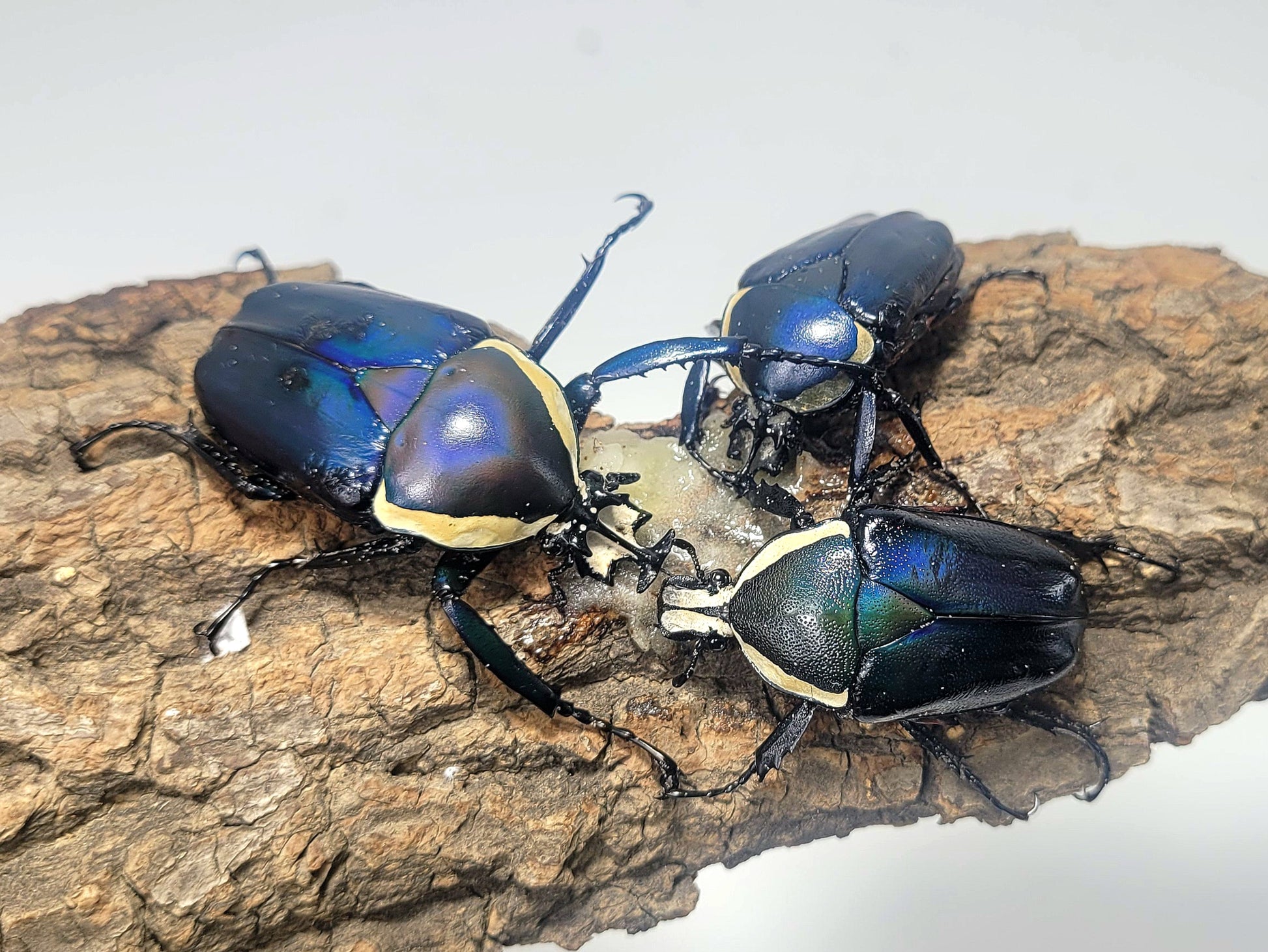 combines beauty with ease of care. Its vibrant metallic blue coloration and impressive size make it a standout in any collection. While they require specific care to thrive, their straightforward diet and manageable breeding make them suitable for both experienced and aspiring beetle keepers. With the right environment and attention, the Blue Derby Flower Beetle offers a fascinating and rewarding experience for anyone interested in the world of exotic insects.