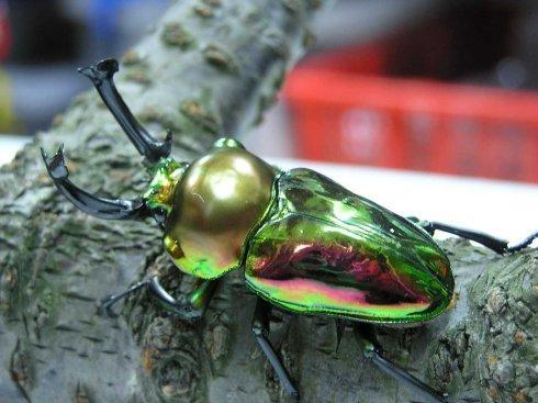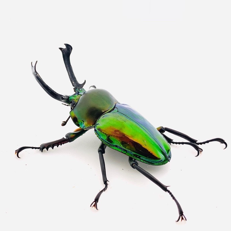 This listing is for green genetic rainbow stag beetle adults or larva, due to uncertainty on how genetics will turn out, the larva purchased may not end up green, for adults, we can certainly guarantee the green color.