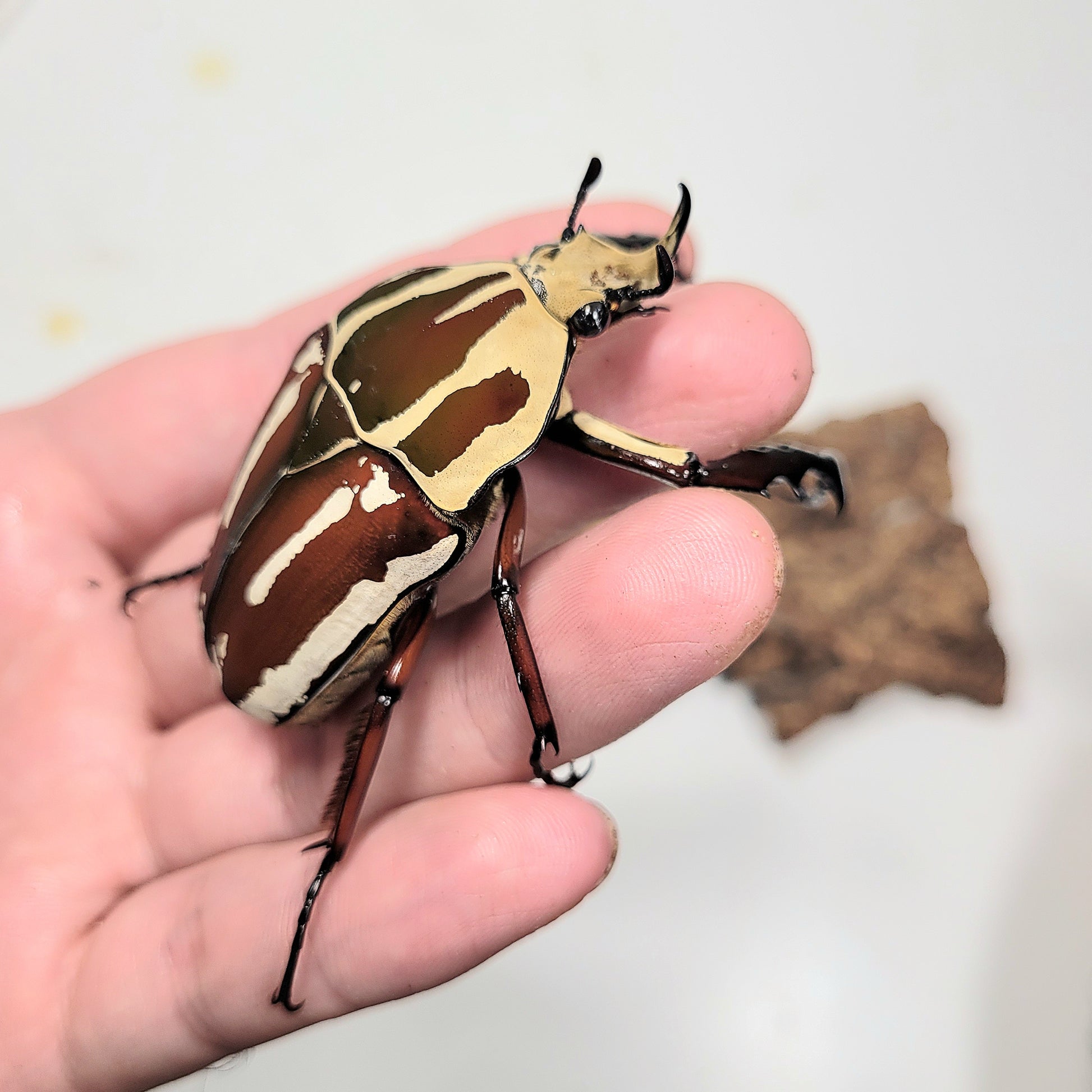 Native to the tropical rainforests of Uganda and surrounding regions in East Africa, Mecynorhina torquata ugandensis "Red" thrives in warm, humid environments. In the wild, these beetles are commonly found in areas with abundant vegetation and decaying organic matter, which they use for feeding and laying eggs. They are diurnal, meaning they are most active during the day, allowing for easier observation compared to nocturnal species.